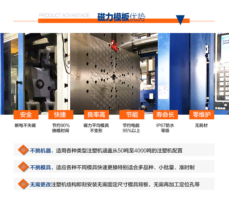 立式注塑機(jī)是目前中國(guó)發(fā)展最快的塑料機(jī)械之一,與工業(yè)發(fā)達(dá)國(guó)家的距離很近。 越來越多的制造業(yè)開始用磁性模板代替手動(dòng)更換模具。 悍威磁電開發(fā)生產(chǎn)的磁性模板與立式注塑機(jī)的配套使用,增強(qiáng)了公司的核心競(jìng)爭(zhēng)力。